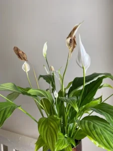 Start with a basic check of your plant’s environment and care routine. Increase humidity by misting leaves or using a humidity tray, and reevaluate your watering schedule — peace lilies like consistently moist soil but not soggy conditions.